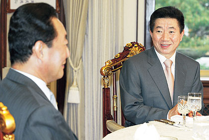 노무현 대통령이 대통령직에 복귀한 14일 저녁 청와대에서 고건 총리와 만찬을 하며 밝은 얼굴로 환담하고 있다.