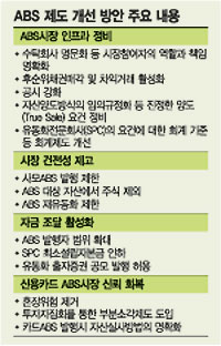 한국증권연구원의 ‘자산유동화제도 개선방안’ 세미나를 통해 알려진 금융감독당국의 자산유동화증권(ABS) 제도 개선 방향은 ABS의 독립성과 투명성을 높여 신용카드사 ABS 문제로 실추된 시장의 신뢰를 회복하겠다는 의지로 풀이된다.