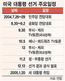 민주당은 이달말 보스턴에서, 공화당은 뉴욕에서 다음달 말 각각 전당대회를 열어 정·부통령 후보를 확정한다. 이후 부시 후보와 케리 후보는 두번에 걸쳐 양자 TV토론을 갖고 한차례 패널 합동토론을 가질 예정이다. 체니와 에드워즈의 TV토론도 따로 잡혀 있다.