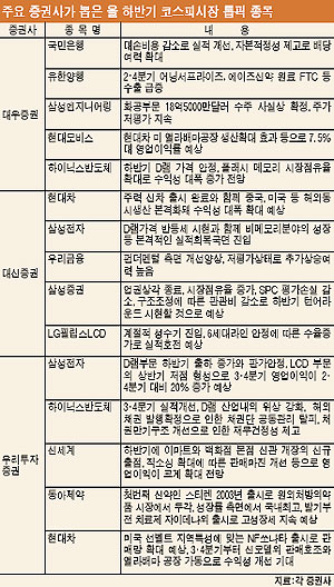 ◇여전히 대형주 매력 ‘굿’=현대차는 주력신차 출시 완료와 해외 동시 생산에 따른 수익성 개선 폭 확대가 메리트로 부각됐다. 특히 미국내 딜러망 확장의 다음 목표지인 썬벨트지역의 특성에 맞는 NF쏘나타 출시로 판매망 확대 예상과 함께 3분기부터 신모델의 판매 호조 및 알라바마 공장 가동에 따른 수익성 개선이 기대됐다. 삼성전자는 D램가격 반등세 시현과 함께 비메모리분야의 성장 등 본격적인 실적 회복국면 진입이 예상됐다. 특히 LCD 부문의 상반기 저점 형성으로 3분기 영업이익이 2분기 대비 20% 증가한 1조9300억원으로 전망된다. 하이닉스반도체 역시 하반기 D램가격 안정과 플래시메모리 시장점유율 확대로 수익성 대폭 증가할 것으로 보인다. 또 해외채권 발행 확정으로 인한 채권단 공동관리 탈피와 채권만기구조 개선으로 인한 재무건정성 제고도 주가 상승을 견인할 것으로 점쳐지고 있다. 국민은행은 대손비용 감소로 인한 실적 개선과 자본적정성 제고에 따른 배당여력이, 우리금융은 펀더맨털 측면의 개선과 추가상승 여력 높은 점이 꼽혔다.