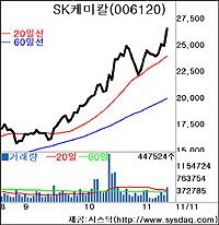 SK케미칼이 3·4분기 실적호조와 증권사들의 긍정적인 전망에 힘입어 이번주 강한 상승세를 나타냈다. 11일 종가는 2만6400원으로 주간상승률은 10.2%였다.