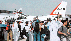 한국항공우주산업(KAI)은 지난 20일 아랍에미리트(UAE) 두바이 엑스포 공항에서 개막된 ‘두바이 에어쇼 2005’에서 국산 초음속 고등훈련기 겸 경공격기인 T-50을 선보였다고 21일 밝혔다
