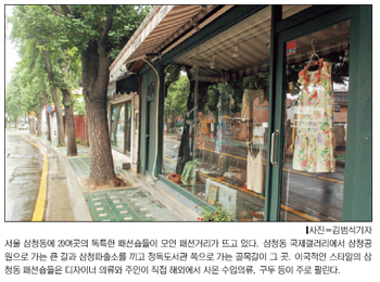 ‘미술관 동네’로 유명한 삼청동이 최근 독특한 패션샵들로 주목받고 있다. 몇개 되지 않던 샵들이 최근 20개 이상 늘었다. 이대나 홍대앞쪽 등 전통적인 강북의 거리패션샵들이 사라지는 추세임을 감안하면 눈여겨볼 만한 변화다.