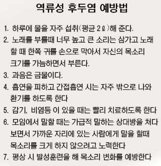급성 후두염이 발생했을 때는 1∼2주간 소리를 줄이고 따뜻한 물을 자주 마셔 목의 점막을 촉촉하게 해주면 상태가 호전된다. 2주가 지났는데도 후두염이 나아지지 않으면 이비인후과를 찾는 게 좋다. 특히 감기나 감기약은 위장관운동을 방해해 역류성후두염을 발생킨다.