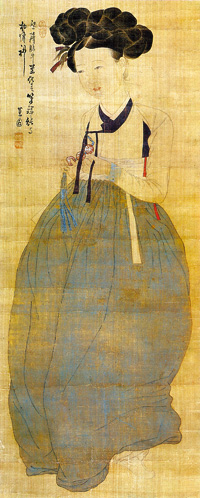 ‘미인도’는 조선시대 후기 패션의 특징인 ‘하후상박(下厚上薄)’의 선정성이 은근히 드러나 있다. 즉 짧은 저고리로 표현된 가냘픈 상체, 이런 상체와 대조적으로 속옷에 의해 겹겹이 싸여 부풀려진 하반신, 속옷의 노출 등으로 선정성을 강조한다. 이런 기녀들은 당대의 패션 리더였다.