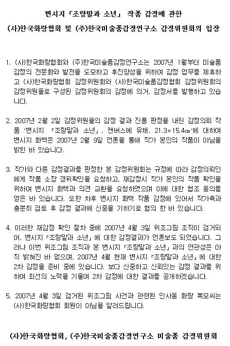 사진은 변시지 ‘조랑말과 소년’에 작품감정에 대한 감정위원회의 입장발표 전문.