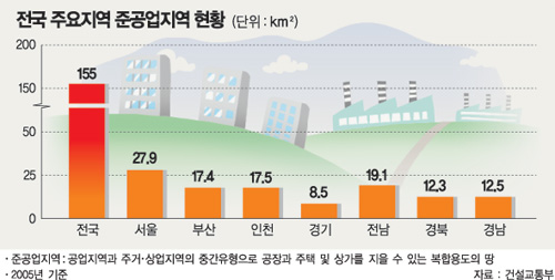서울에서는 구로·금천·영등포구와 뚝섬 부근, 경기도에선 안양·부천·의정부시 등이 대표적인 준공업지역이다.