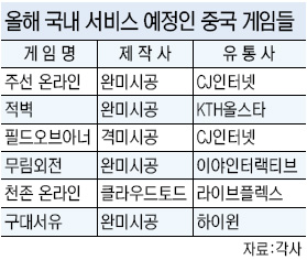 또 KTH가 퍼블리싱하기로 한 ‘적벽’, 하이윈이 서비스 예정인 ‘구대서유’ 모두 중국산 MMORPG다. 최근 게임시장에 뛰어든 라이브플렉스도 중국 게임인 ‘천존 온라인’의 국내와 필리핀 판권을 따내 서비스를 준비하고 있다.
