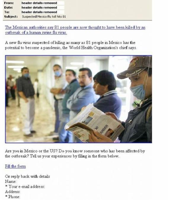 해당 스팸메일에는 ‘돼지 인플루엔자 관련 질문과 답변’ 이라는 제목의 PDF 문서가 첨부돼 있으며, 사용자가 이를 열면 PDF 파일 안에 악성코드가 어도비 취약점(BID 33751)을 이용해 이용자의 개인정보를 이메일을 통해 유출시키게 된다.