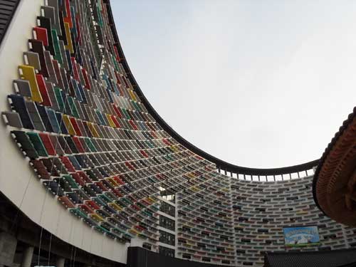 한편, 국내 최초로 조성되는 한옥회랑도 충남 부여의 인기 관광 명소로 떠오를 것으로 예상된다. 유선형으로 설계된 콘도미니엄 앞에 위치한 원형한옥회랑은 현재 공정율 95%로, 고대 해상 왕국이었던 백제의 위대함과 큰 기상을 하늘을 상징하는 원을 통해 표현한 조형물이다.