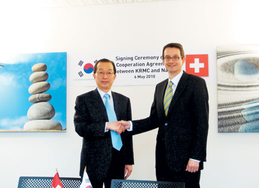 ■사진설명=민계홍 방폐공단 이사장(왼쪽)과 토마스 어니스트 스위스 방폐관리기관 사장이 지난 5월 6일 기술협력 협정을 체결한 후 기념촬영하고 있다.