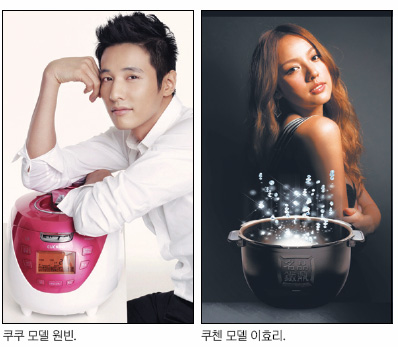1일 업계에 따르면 쿠첸은 지난 9월 6일부터 결혼시즌을 맞아 이효리를 새 모델로 기용한 공중파 CF를 선보였다. 같은 날 쿠쿠도 원빈이 출연한 CF를 일반에 선보였다.