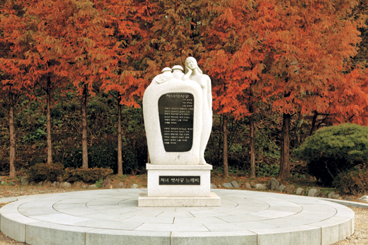 | ▲ 처녀가 감싸고 있는 경남 함안의 노래비. |
