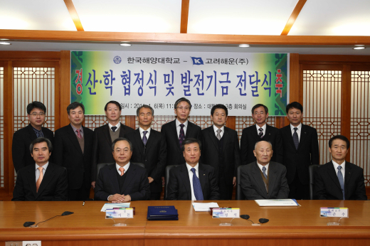 【부산=노주섭기자】한국해양대(총장 오거돈)는 고려해운(대표이사 박정석)과 6일 대학본부 3층 회의실에서 ‘산학협정식 및 대학발전기금 전달식’을 가졌다.