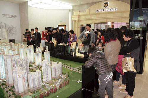 | ▲ 봄 분양 성수기가 시작된 가운데 전국 견본주택마다 청약자들이 몰리며 청약 열기가 달아오르고 있다. 특히 부산 등 지방 분양시장은 분양단지마다 청약 대박을 기록하고 있어 이 같은 청약 열기가 서울 수도권까지 이어질지 관심이 모아지고 있다. 롯데건설이 지난주 부산 화명동에서 분양한 화명롯데캐슬 카이저 견본주택. |
