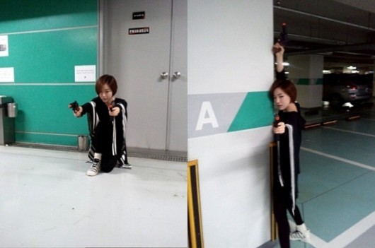 사진 속 가인은 비장한 표정으로 총은 겨누는 모습을 보여주고 있지만, 검은색 트라이닝복 차림에 운동화를 신고 어딘가 어설픈 모습을 선보여 카리스마보다는 귀여운 매력을 선사하고 있다.
