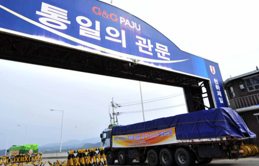 민족화해범국민협의회는 26일 북한 사리원시에 밀가루 300t(1억8천만원 상당)을 25t 트럭 12대에 실어 북측에 전달한다. 밀가루를 실은 트럭들이 통일대교 남단을 지나고 있다.