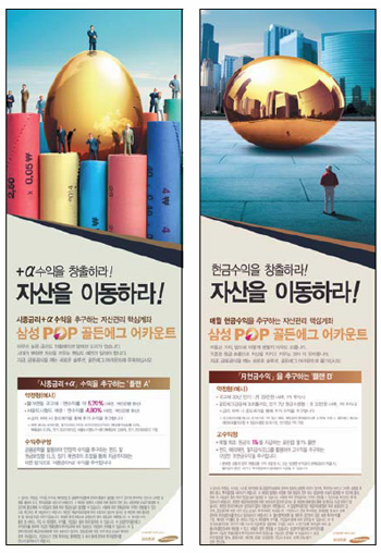 '삼성 POP 골든에그 어카운트' 광고에서는 요즘같이 어렵고 급변하는 투자환경에서 고민하고 있는 투자자들에게 차별화된 자산관리 솔루션을 제공하고 있음을 거대한 골든에그 형상으로 표현했다.