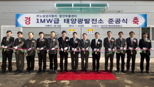 르노삼성자동차가 지난달 31일 함안부품센터 지붕에 935.9㎾ 규모의 태양광 발전소 설치 준공식을 가졌다.