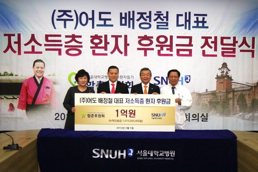 ㈜어도 배정철 대표와 부인 김선미씨가 5일 서울대병원을 방문해 저소득층 환자 지원금 1억원을 함춘후원회에 전달했다.