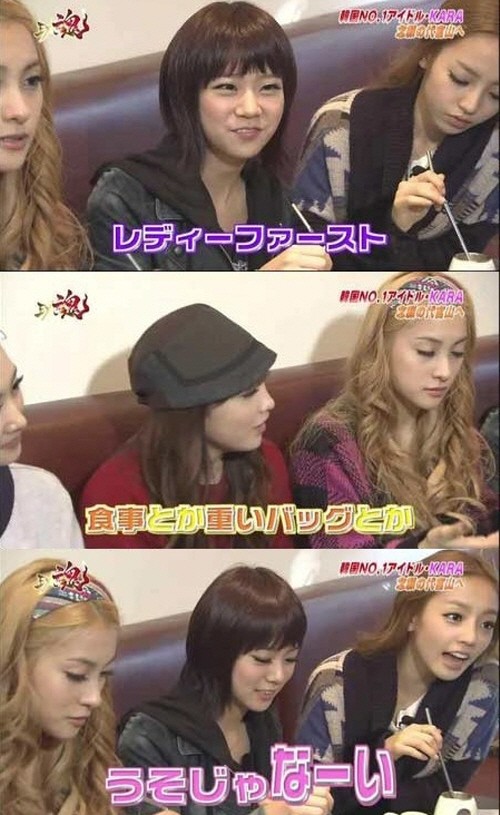 공개된 사진은 카라 다섯 멤버가 두 명의 남자 진행자와 한국 문화에 대한 토크쇼를 벌이는 프로그램을 캡쳐한 것으로 한승연은 “한국에서는 보통 남자들이 데이트 비용을 전부 낸다”고 말했으며 강지영 역시 “밥값도 전부 내고 가방도 들어 준다”고 덧붙였다.