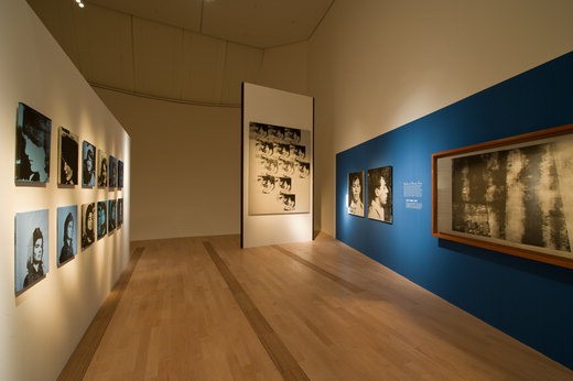 '앤디 워홀:영원한 15분'전의 '공장 시대' 전시실에 걸려 있는 '죽음과 재난' 연작. 워홀이 1962년 신문에서 비행기사고 기사를 접한 이후 시작된 죽음과 재난 연작은 사고나 사망사건 등의 보도사진을 실크스크린 기법으로 확대·재생산한 작품이다. 왼쪽은 케네디 미국 대통령 암살 이후 제작된 '재키 케네디'.