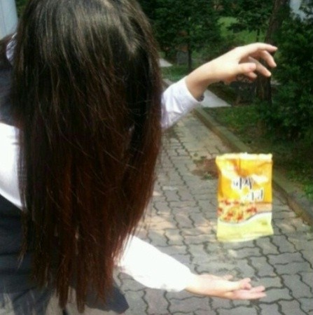 공개된 사진에는 한 여고생이 긴 머리를 앞으로 늘어뜨려 얼굴 전체를 가린 채 두 손을 이용해 과자봉지를 공중에 띄우고 있다.