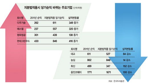 예를 들어 다우기술은 지난해 개별기준으로 당기순이익이 262억원을 기록했지만 지분법을 적용해 보니 당기순이익이 611억원으로 무려 3배 가까이 늘어났다. 같은 기간 대교의 경우는 당기순이익이 611억원에서 지분법 적용 시 527억원으로 오히려 줄어들기도 했다.