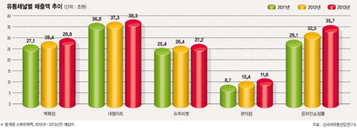 신세계유통산업연구소에 따르면 온라인쇼핑몰과 TV홈쇼핑 등을 포함한 무점포 판매의 2012년 매출은 37조6000억원가량으로 37조3000억원가량의 대형 마트를 추월했다. 온라인쇼핑몰 매출이 2~3년 안에 대형 마트 매출을 넘어설 것이란 전망이다.