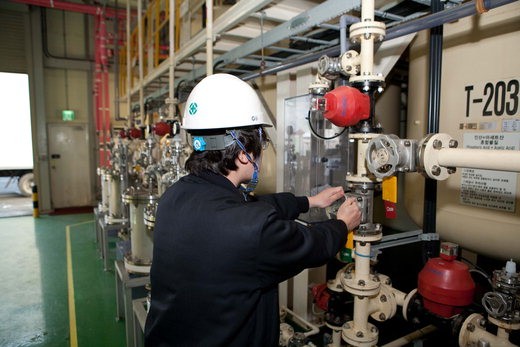 디스플레이와 2차전지용 전해액 생산 등 국내 반도체용 소재 산업 선도기업인 솔브레인은 1986년 창사 이후 고속성장을 거듭해 현재 종업원 1250명에 연 매출 6000억원 규모의 중견기업으로 자리매김했다. 한 근로자가 공장에서 설비를 점검하고 있다.