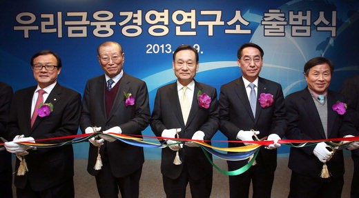 우리금융지주는 9일 서울 회현동 스테이트타워 남산에서 우리금융경영연구소 출범식을 열었다. 이팔성 우리금융지주 회장(왼쪽 세번째), 이순우 우리은행장(왼쪽 첫번째), 황록 우리금융경영연구소 대표이사(왼쪽 네번째) 등이 출범 기념 테이프 커팅을 하고 있다.
