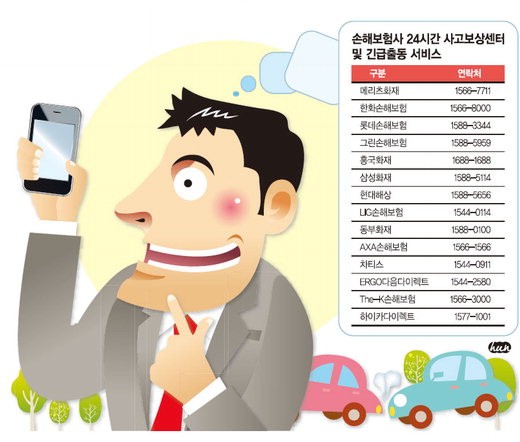 주요 서비스 내용은 △비상급유 △배터리 충전 △타이어 펑크 교체 △잠금장치 해제 △견인 등이다. 긴급출동서비스 신청은 전화로 하며 일부 보험사는 애플리케이션을 설치하면 스마트폰으로도 신청할 수 있다.