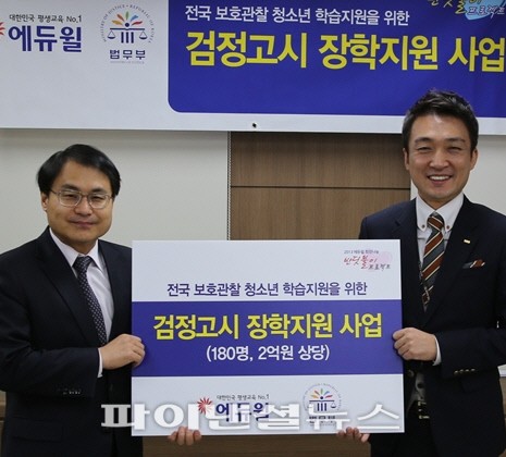 ㈜에듀윌(대표 양형남)은 법무부와 학습지원 협약을 맺고 전국 보호관찰 청소년 180명에게 검정고시 강의와 교재 2억원 상당을 무상 지원한다고 14일 밝혔다. 지난 13일 진행된 검정고시 학습지원 협약식에서 이건주 법무부 범죄예방정책국장(왼쪽)과 남영택 에듀윌 이사가 기념촬영을 하고 있다.