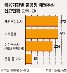 8일 금융권에 따르면 지난해 6월부터 12월까지 금융감독원에 신고된 불공정 채권 추심 건수는 모두 814건이다. 이를 각 금융기관별로 보면 채권추심을 주로 하는 신용정보회사들에 대한 불공정 신고가 272건으로 가장 많고 저축은행 267건, 카드사나 캐피털사 등 여신금융사들에 대해서도 224건의 불공정 추심이 신고됐다. 채권추심회사와 저축은행, 카드사 및 캐피털사에서 모두 각각 200건이 넘는 불공정 채권 추심 신고가 접수된 셈이다.