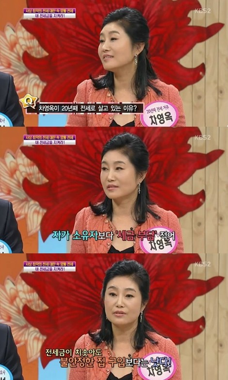 이날 탤런트 차영옥은 “20년 째 전세로 생활하고 있다”고 밝혀 출연진들을 놀라게 했다.