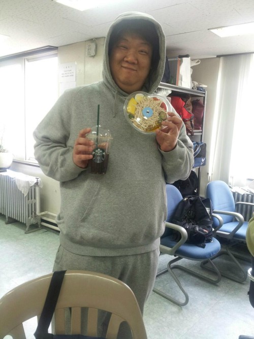 공개된 사진 속에서 유민상은 한손에는 커피와 다른 손에는 닭가슴살 샐러드를 들고 환한 미소를 지어보이고 있다.