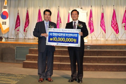 무학그룹 좋은데이사회공헌재단은 최근 (사)한국외식업중앙회 부산광역시 지회에 외식업 종사자 자녀를 위한 장학금 1000만원을 전달했다고 15일 밝혔다. 부산 온천동 농심호텔에서 열린 (사)한국외식업중앙회 부산광역시지회 정기총회장에서 강민철 ㈜무학 사장(오른쪽)이 서정철 외식업중앙회 부산광역시지회 지회장에게 장학금을 전달하며 기념촬영을 하고 있다.