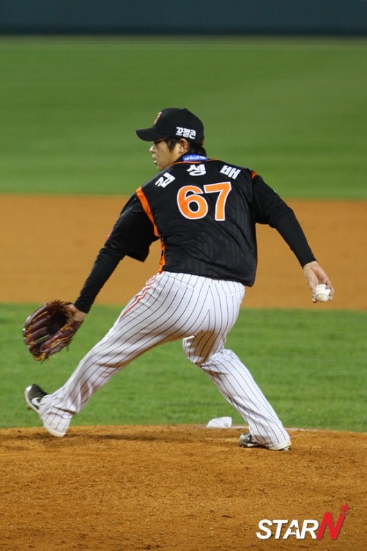 '2013 한국야쿠르트 세븐프로야구' LG 트윈스와 롯데 자이언츠의 경기가 27일 오후 잠실구장에서 열린 가운데 롯데 김성배가 마무리 투수로 올라와 역투하고 있다.