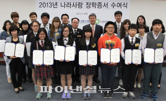 현대차 정몽구 재단은 9일 서울 계동 현대빌딩에서 '2013년도 나라사랑 장학금 수여식'을 개최하고, 순직·공상 경찰관 및 소방관 자녀 등 연간 총 350명에게 장학금을 지급한다고 밝혔다.