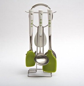 조리에 필요한 도구들만 선별한 알찬 구성이 눈에 띈다. 키친툴 걸이, 국자, 면 국자, 거름망, 뒤집개, 스패출러, 주걱이 한 세트다.