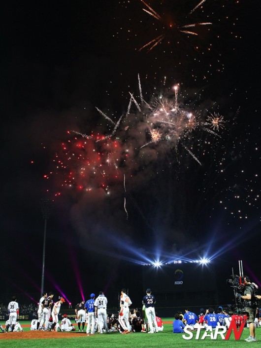 ‘2013 한국야쿠르트 세븐 프로야구 올스타전’이 19일 오후 경북 포항시 포항야구장에서 열린 가운데 올스타전 선수들이 경기 종료 후 불꽃놀이를 바라보고 있다.