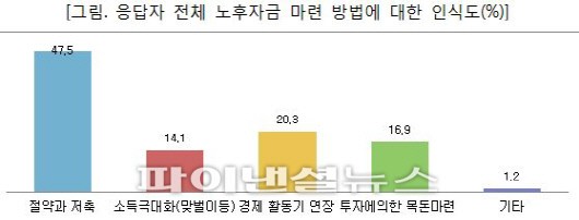 노후준비 방법으로는'절약과 저축(47.5%)'이 가장 높게 나타났고, 노후자산 운용은 연령층에 비례해 보수적인 투자성향을 보였다. 노후준비 상품으로는 전 연령대에서 '6~10년' 짜리 중장기 상품을 가장 선호했다.