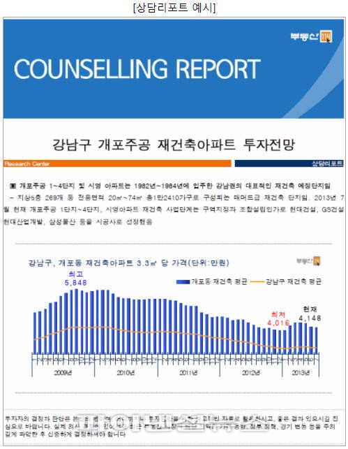 부동산114는 유망 지역의 아파트나 오피스텔 등을 대상으로 투자 전략을 소개하는 '상담리포트' 서비스를 오픈했다고 2일 밝혔다.