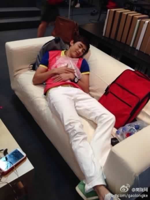 닉쿤은 촬영장 소파에 길게 누워 미소를 지은 채 떡실신한 모습으로 다리가 길어 소파 밖으로 빠져 나와있다.
