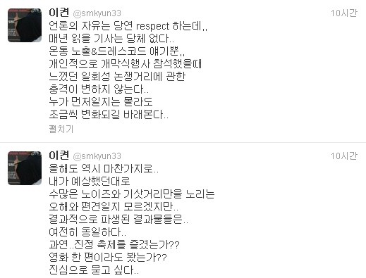 이어 이켠은 "언론의 자유는 당연 존중하는데 매년 읽을 기사는 당체 없다. 온통 노출 & 드레스코드 얘기 뿐"이라며 "개인적으로 개막식 행사 참석했을 때 느꼈던 일회성 논쟁거리에 관한 충격이 변하지 않는다. 누가 먼저일지는 몰라도 조금씩 변화되길 바라본다"고 밝혔다.