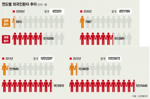 9일 보건복지부에 따르면 국내 병원을 찾은 해외환자는 의료관광이 본격적으로 시작된 지난 2009년 6만201명(실환자 수 기준)에서 2010년 8만1789명, 2011년 12만2297명으로 증가했다. 2012년은 15만5672명이며 올해 목표는 20만명, 2020년에는 100만명이 목표다. 특히 한국관광공사는 2020년 의료관광객 100만명 시대를 열기 위해 기반조성과 마케팅 고도화 전략을 발표한 바 있다.