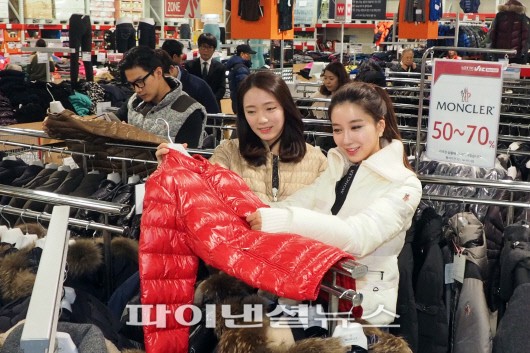 18일 서울 영등포동 롯데마트 빅마켓에서 몽클레르 패딩을 백화점 판매가 대비 50~70% 저렴하게 판매해 눈길을 끌고 있다. 가격은 마야스타일 81만5천원, 아독사스타일 93만5천원이다./사진=서동일기자