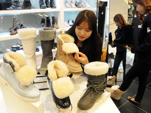 부산 부전동 롯데백화점 부산본점은 2층 슈콤마보니 구두매장에서 양털 내피가 부착된 앵클부츠, 롱부츠 등을 선보여 고객들로부터 패션 포인트 상품으로 큰 인기를 얻고 있다고 26일 밝혔다. 고객들이 양털 내피 부츠를 살펴보고 있다.