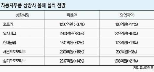 이 밖에 현대공업(차량용 시트), 새론오토모티브(브레이크 마찰재), 에스엘(자동차 헤드램프), 우리산업(전장부품), 삼기오토모티브(엔진과 변속기 부품), 상신브레이크(브레이크 패드), 평화정공(자동차문 개폐장치) 등 주요 자동차부품사들도 중국시장 효과 등으로 실적 개선이 주목된다.