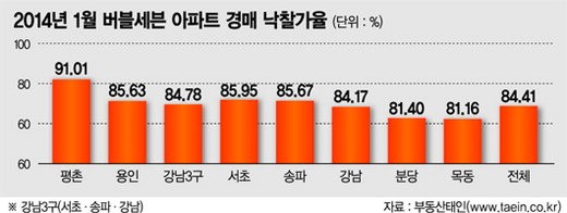 수도권 아파트 매매가격 상승을 주도하며 한때 전국적으로 부동산 투기 광풍을 일으켰던 '버블세븐'(강남3구, 목동, 분당, 평촌, 용인) 지역 아파트 경매 낙찰가율이 일제히 80%를 넘어섰다. 지난 2011년 2월 이후 35개월 만에 처음이다.